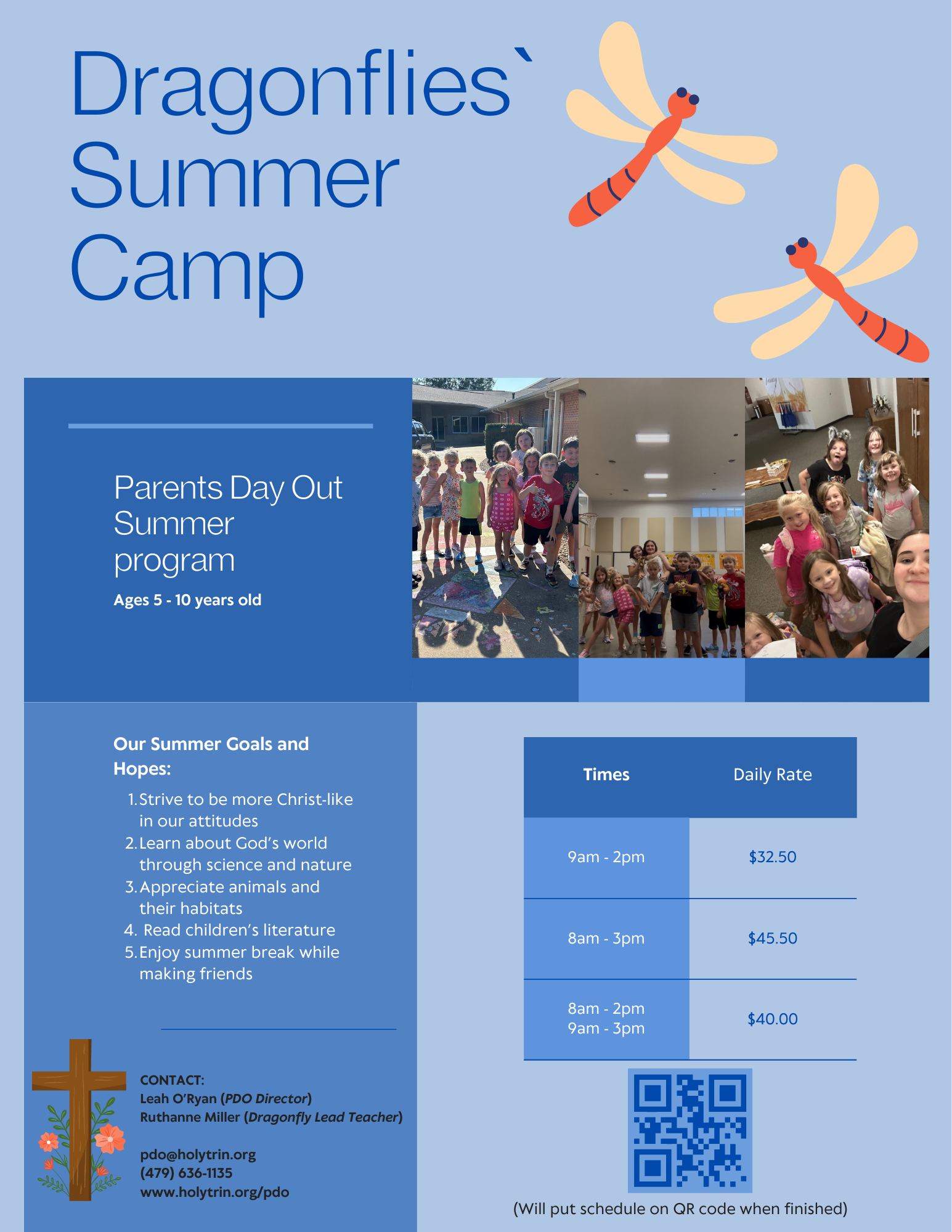 Holy Trinity PDO runs year-round with week-long breaks for New Year’s Eve, Spring Break, July 4th, Thanksgiving, and Christmas. We are closed on Martin Luther King Day, President’s Day, Memorial Day, Juneteenth, and Labor Day. We are open Monday through Thursday, 8am-3pm.